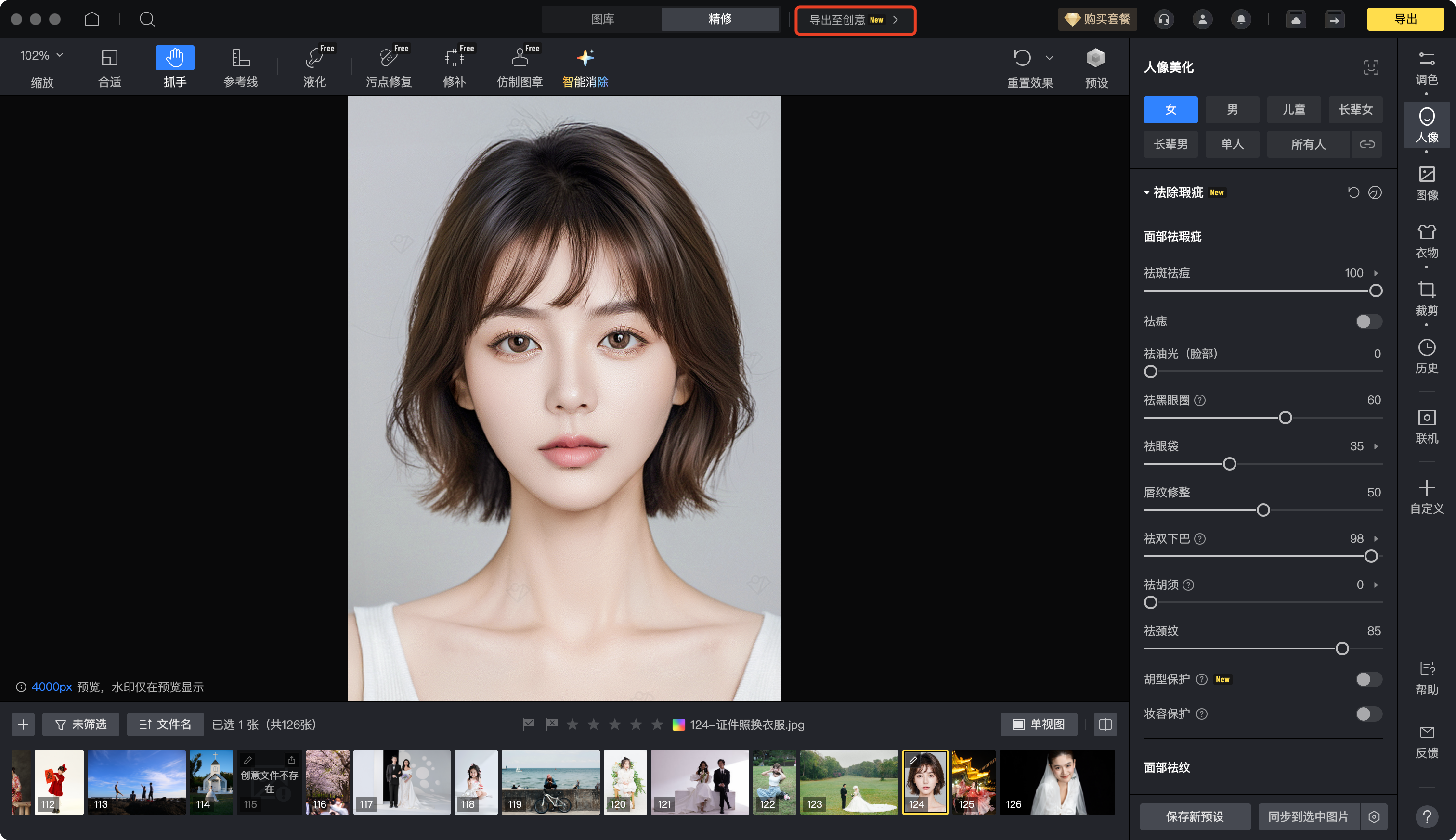选中需要进入创意模块继续编辑的图片,点击最上方的「导出至创意」按钮,即可将选中的图片导出至创意模块。