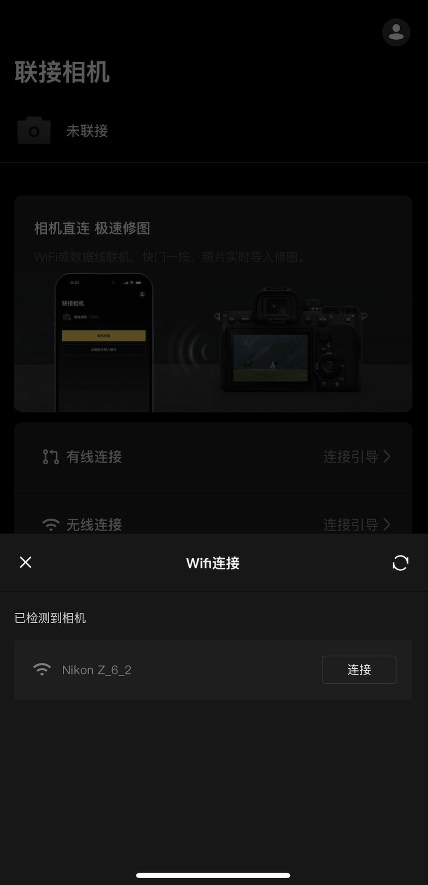 相机连接成功后将会弹出「相机连接成功」的提示,此时便可直接进入「联机拍摄」或选择「从相机中导入照片」。