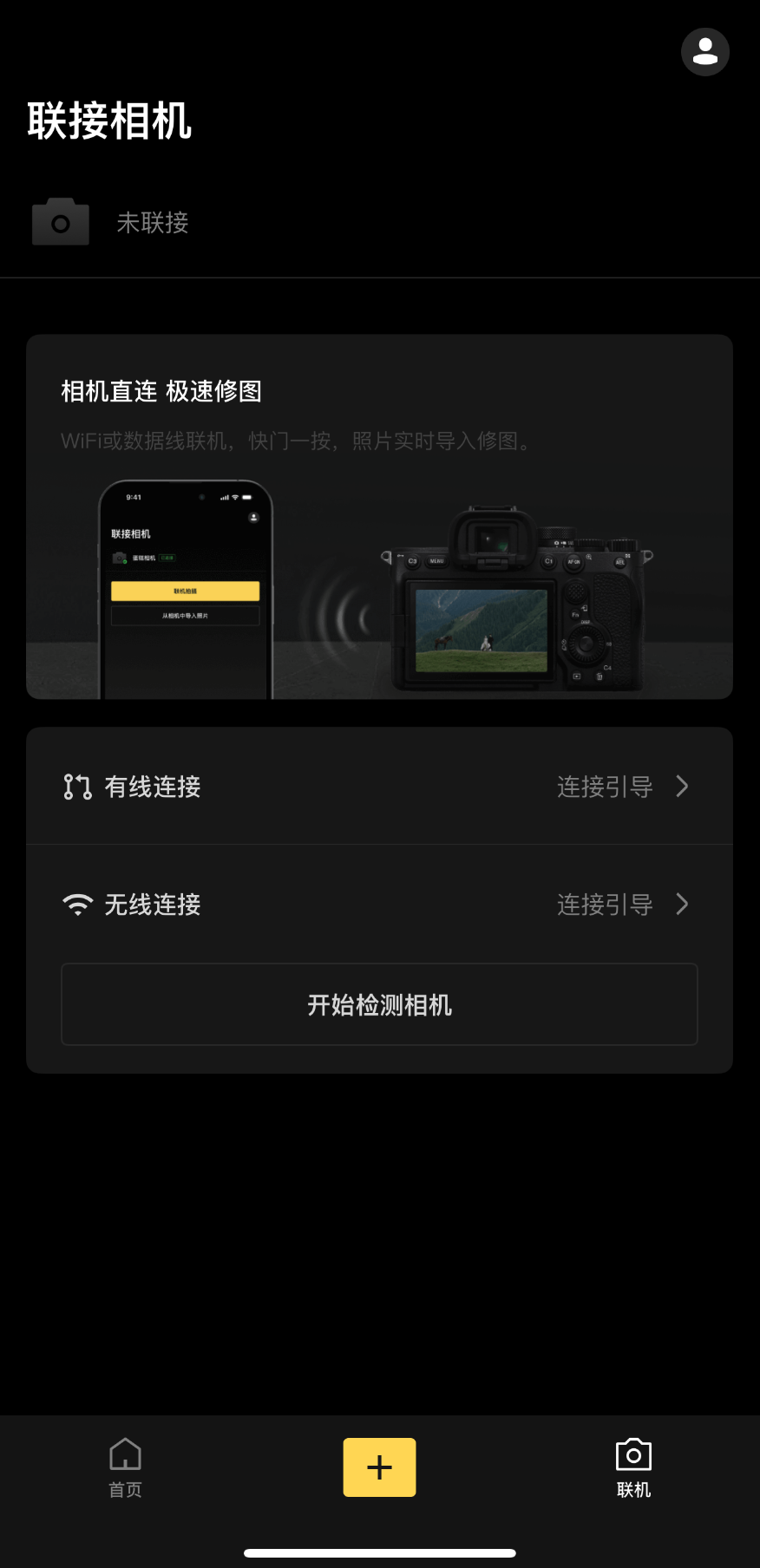 若您首次使用像素蛋糕或从未创建任何项目,首页选择「联机拍摄」或底部右侧「联机」按钮,进入后轻触「开始检测相机」。当搜索到相机后,会显示相机型号,轻触「连接」即可。
