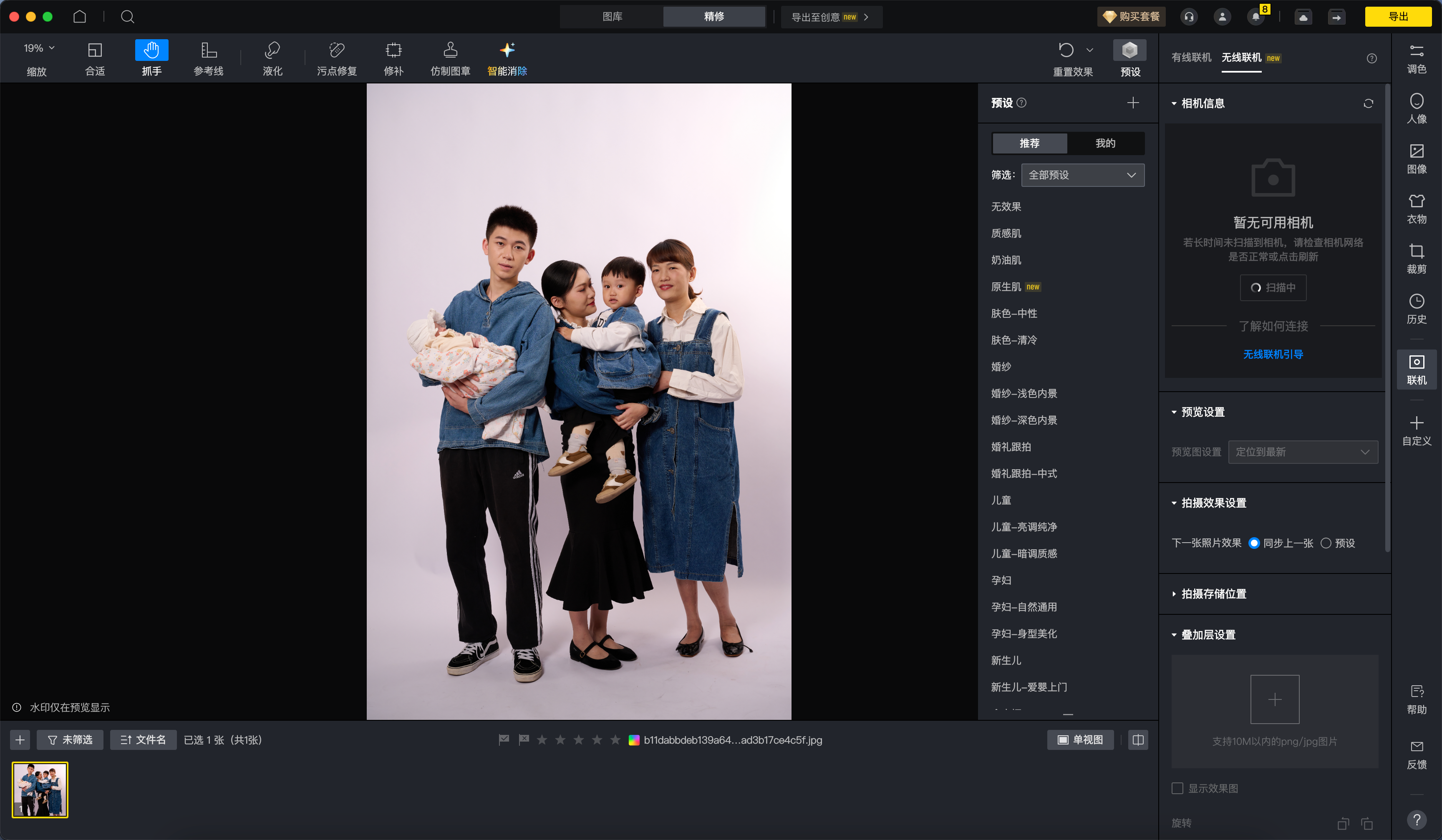 支持选择「通用、人像、证件照、活动、婚礼、家庭、儿童、学校、孕妇、私房」等10种场景。