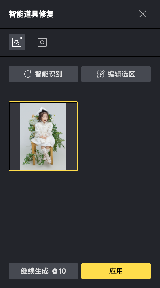 如生成效果不佳,可重新修改选区范围后点击「继续生成」按钮生成一张新的效果图,满意后点击「应用」即可完成道具修复。