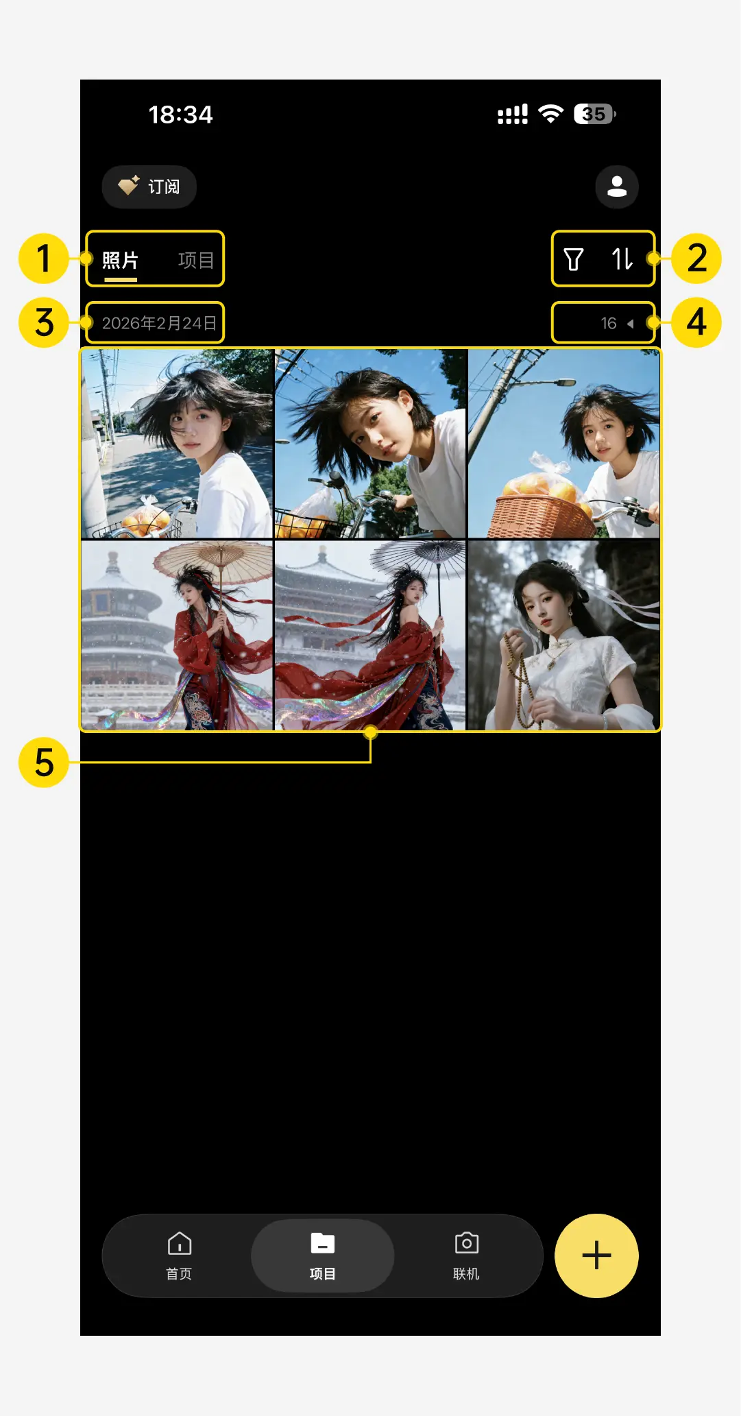 3、项目创建日期:按日期维度展示照片,同一天创建的所有项目中的照片将自动归类到该日期下;