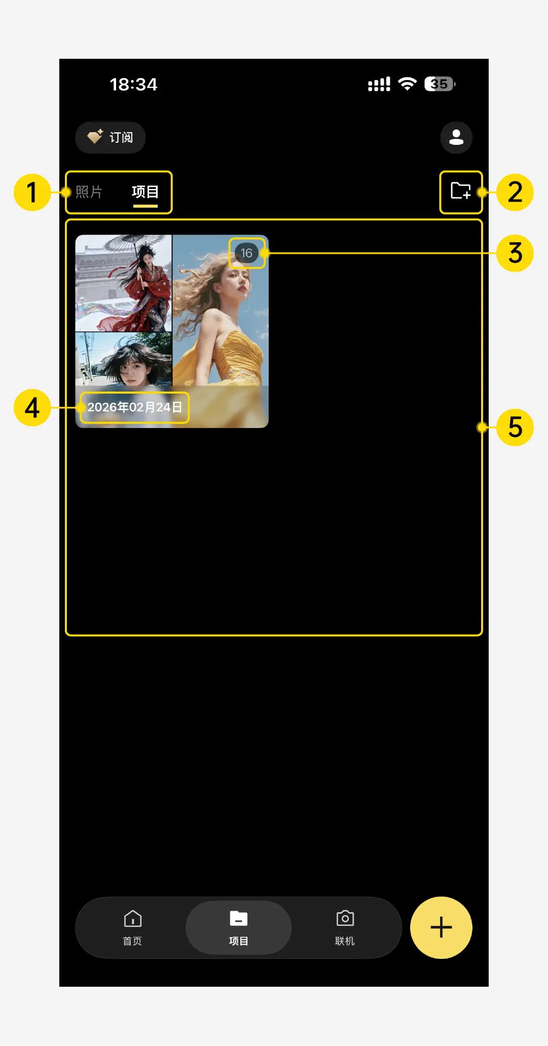 联机拍摄:通过联机拍摄的形式导入照片创建新项目。