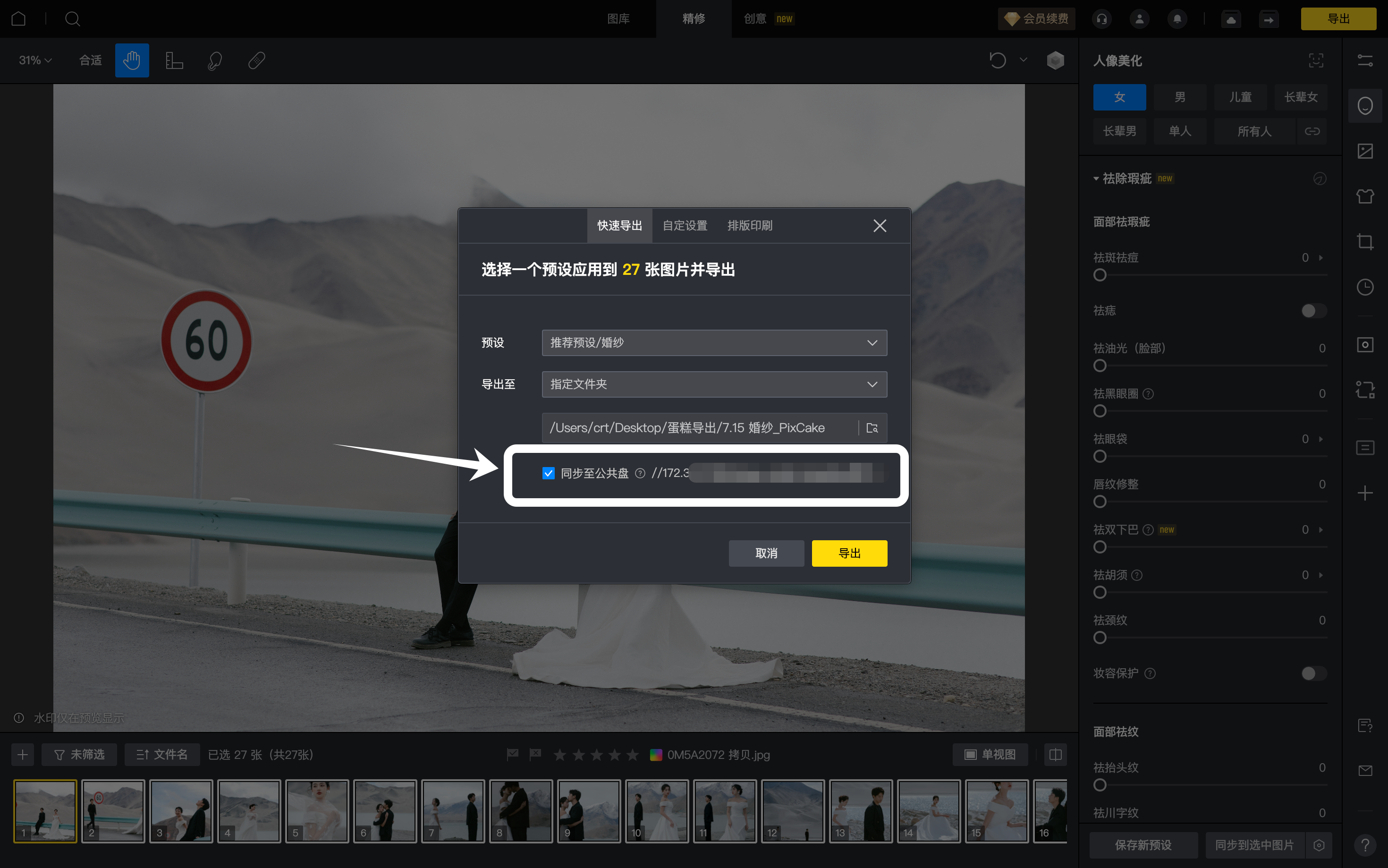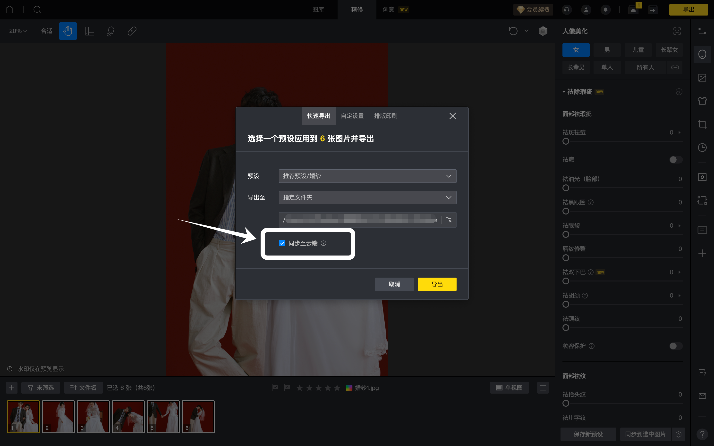 2、选中需处理的照片,进行调色、祛除瑕疵、人像液化等修图操作。完成修调后,选中照片并点击右上角导出,导出时根据两种图片储存方式勾选对应设置(同步至公共盘/同步至云端)。