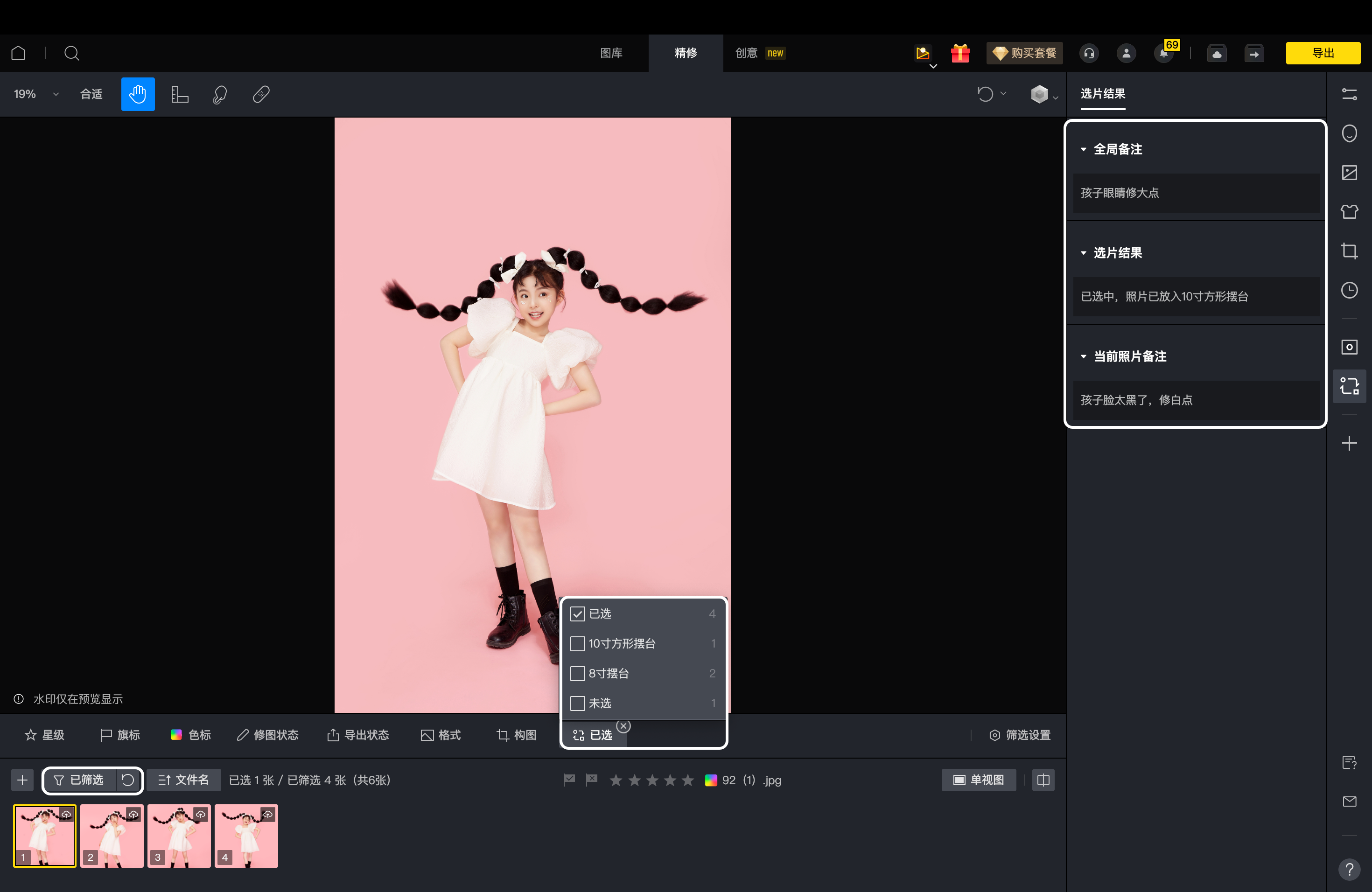 3、右侧「选片结果」模块展示曲奇选片时添加的「全局备注」、「选片结果」和「当前照片备注」,可根据备注内容进行精修,完成精修后点击右上角导出。