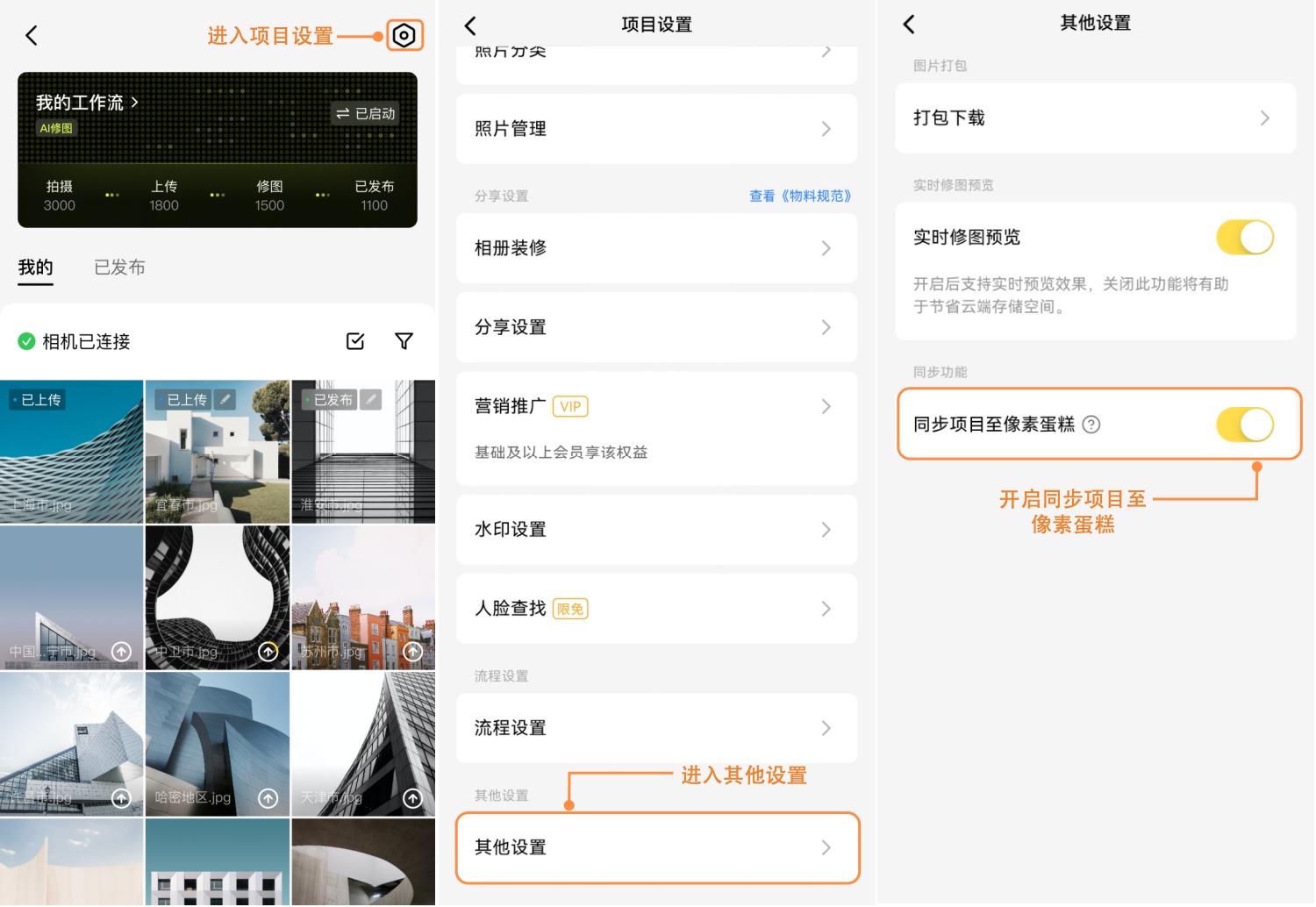 ⚠️Tips:也支持从像素芝士创建选片交付项目,打开「同步项目至像素蛋糕」选项,修调后发布的项目图片默认存储在云端。