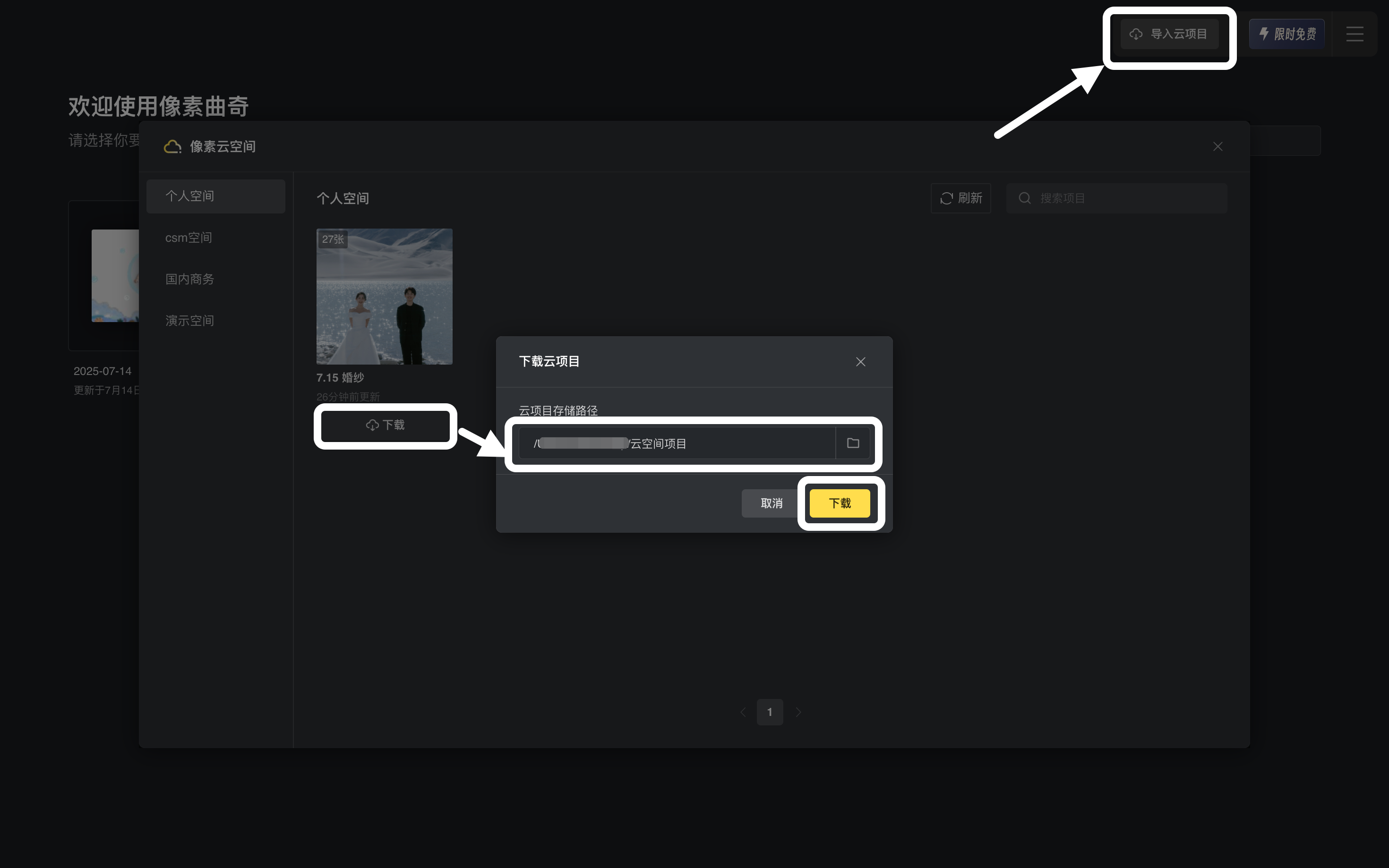 下载并打开像素曲奇,点击右上角「导入云项目」,搜索项目名称,点击「下载」按钮;