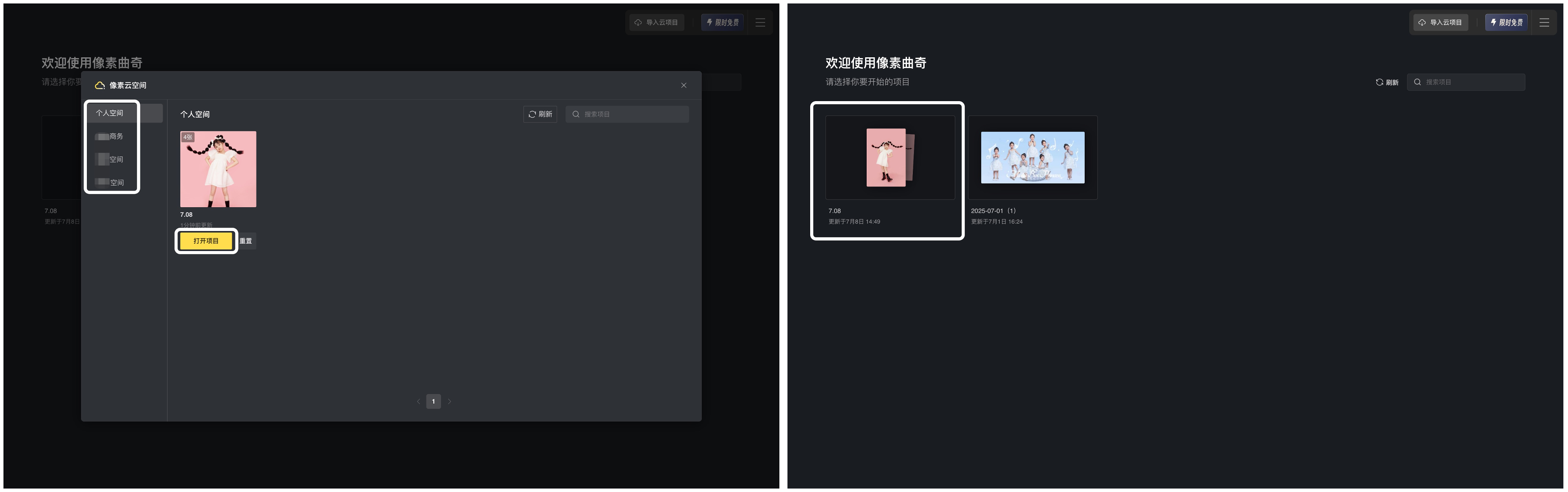 1、打开像素蛋糕,在云空间创建新项目,选择将图片存储在公共盘或云端。若此前已创建本地项目,也支持将本地项目上传至云端。
