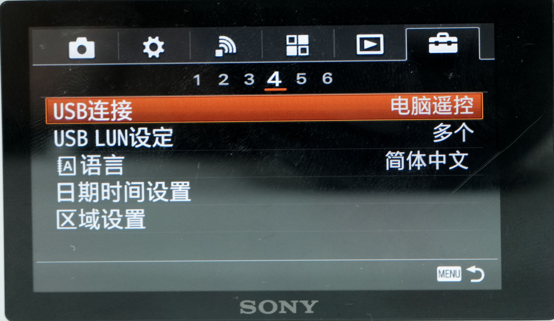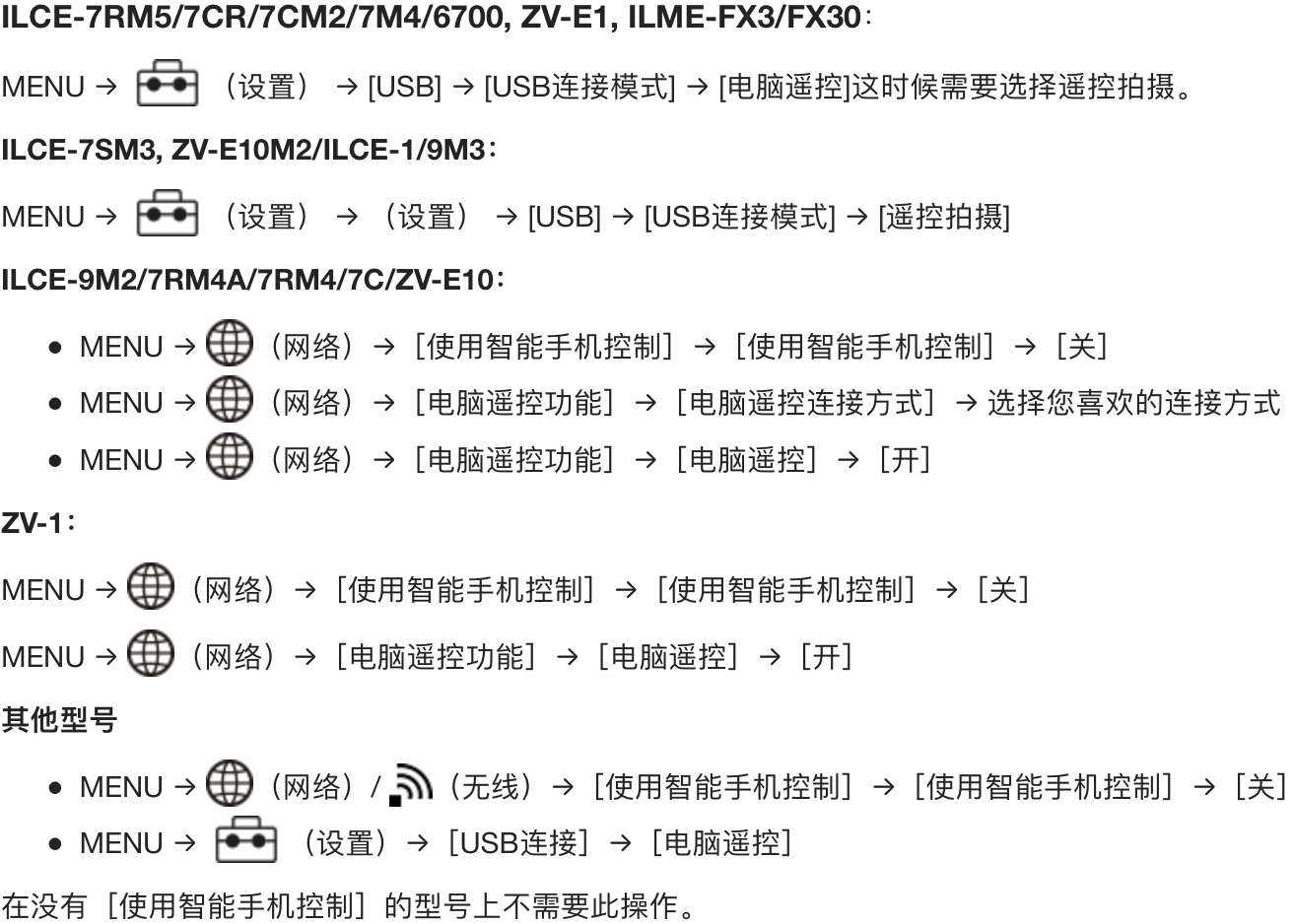先确保电脑遥控功能关闭:MENU → 网络 → 连接/电脑遥控 → 电脑遥控功能 → 电脑遥控 → 关;