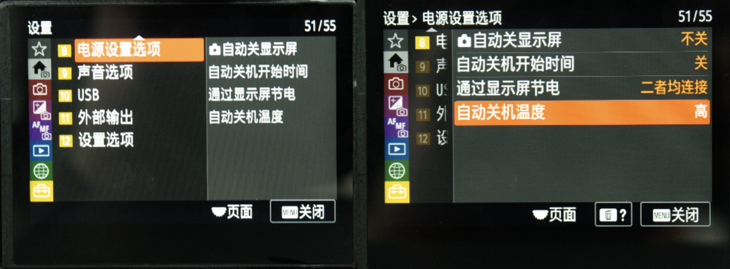 开启省电模式后,一段时间不对相机进行操作相机会进入休眠,会断开与电脑的连接,因此需要关闭该模式,以索尼7RM5为例,找到「电源设置」选项,自动关机开始时间设置为「关」,自动关机温度设置为「高」。