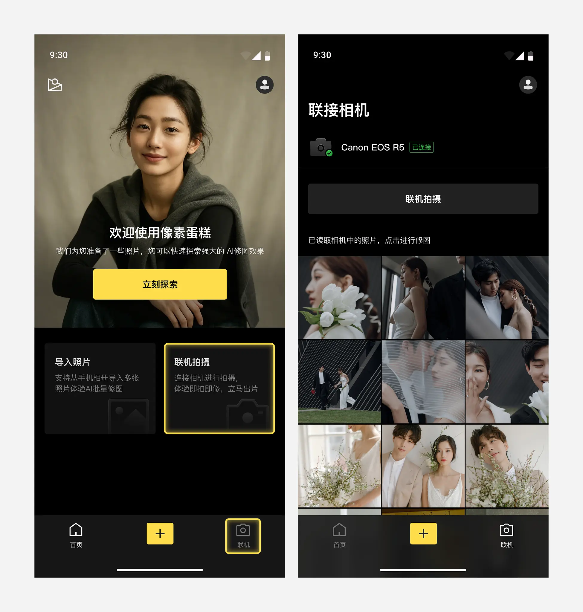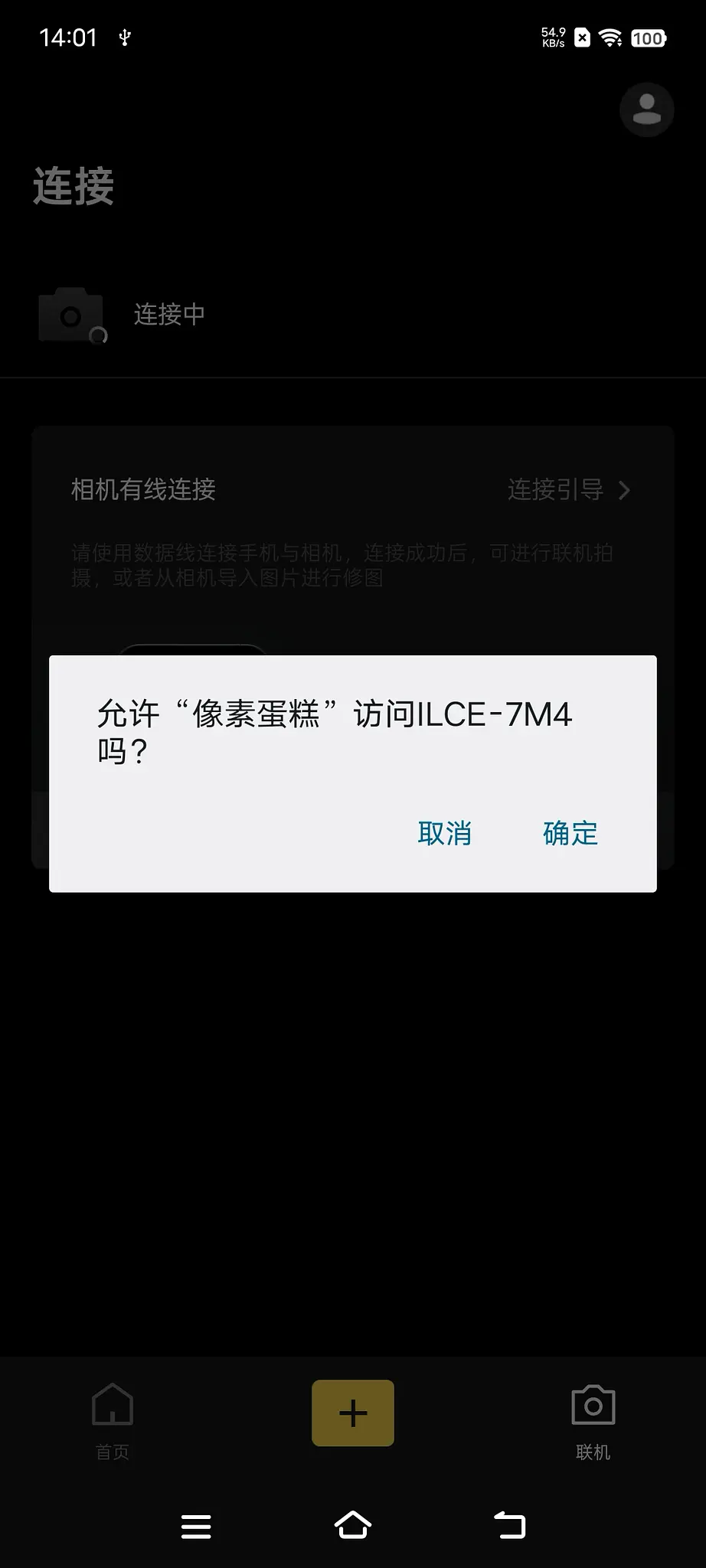 若您首次使用像素蛋糕或从未创建任何项目,首页选择「联机拍摄」或底部右侧「联机」按钮,进入后若有显示相机型号以及「已连接」标识,则表示联机成功,如图所示。