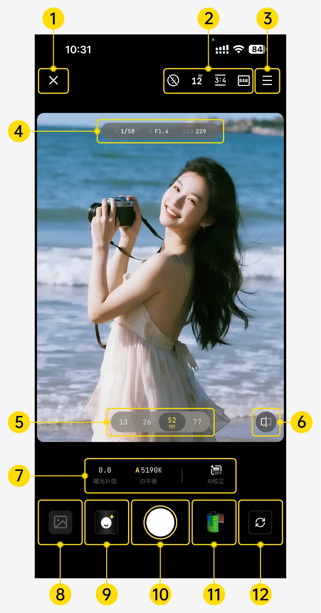 7、快门、光圈、ISO、曝光补偿、白平衡:均只显示相机相关设置,不可在手机端操作;