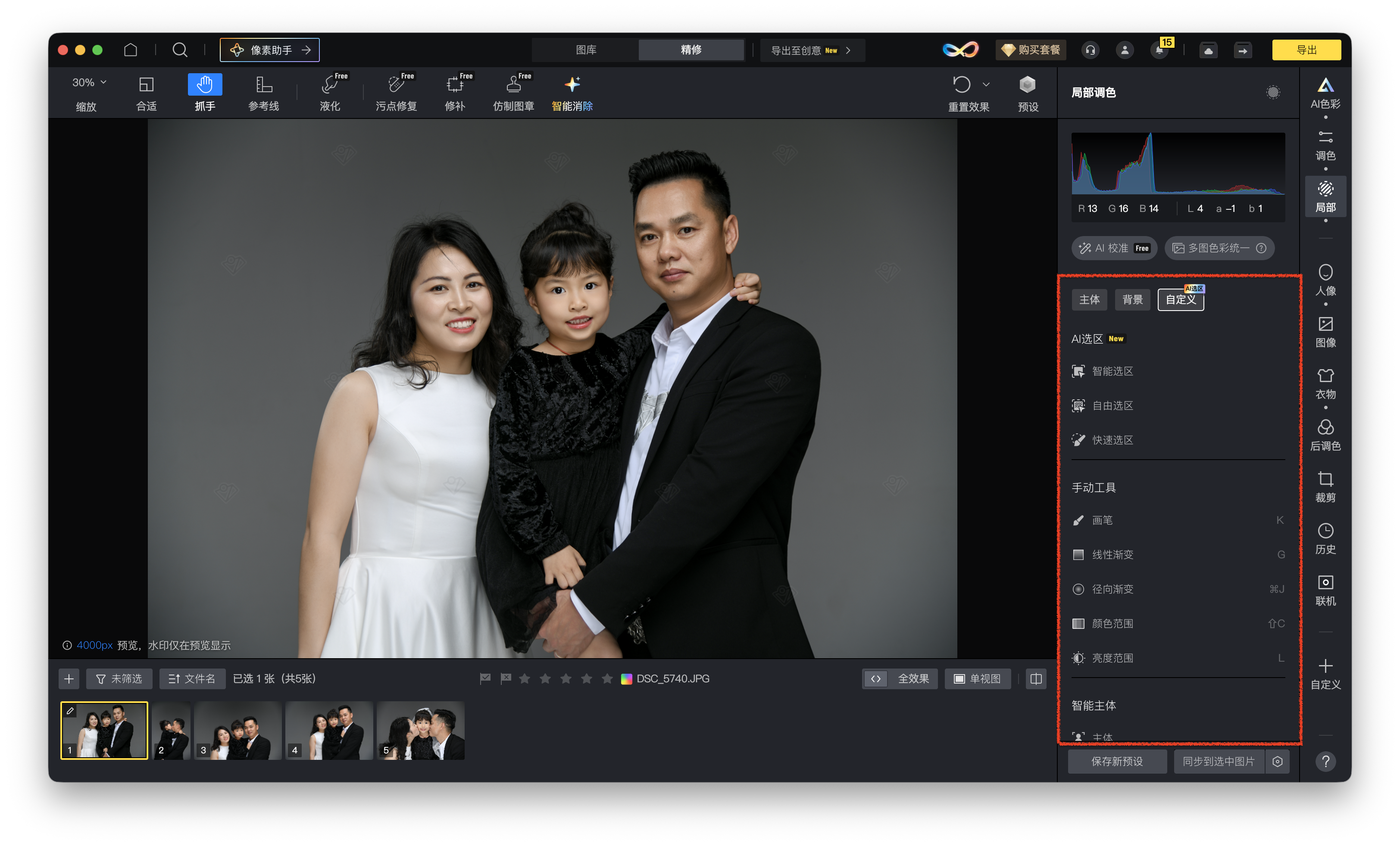 如需对图片部分区域进行更灵活的调色处理,可创建自定义蒙版。借助AI选区、画笔、线性渐变、径向渐变、颜色范围和亮度范围等工具,实现图片区域的精准选取。