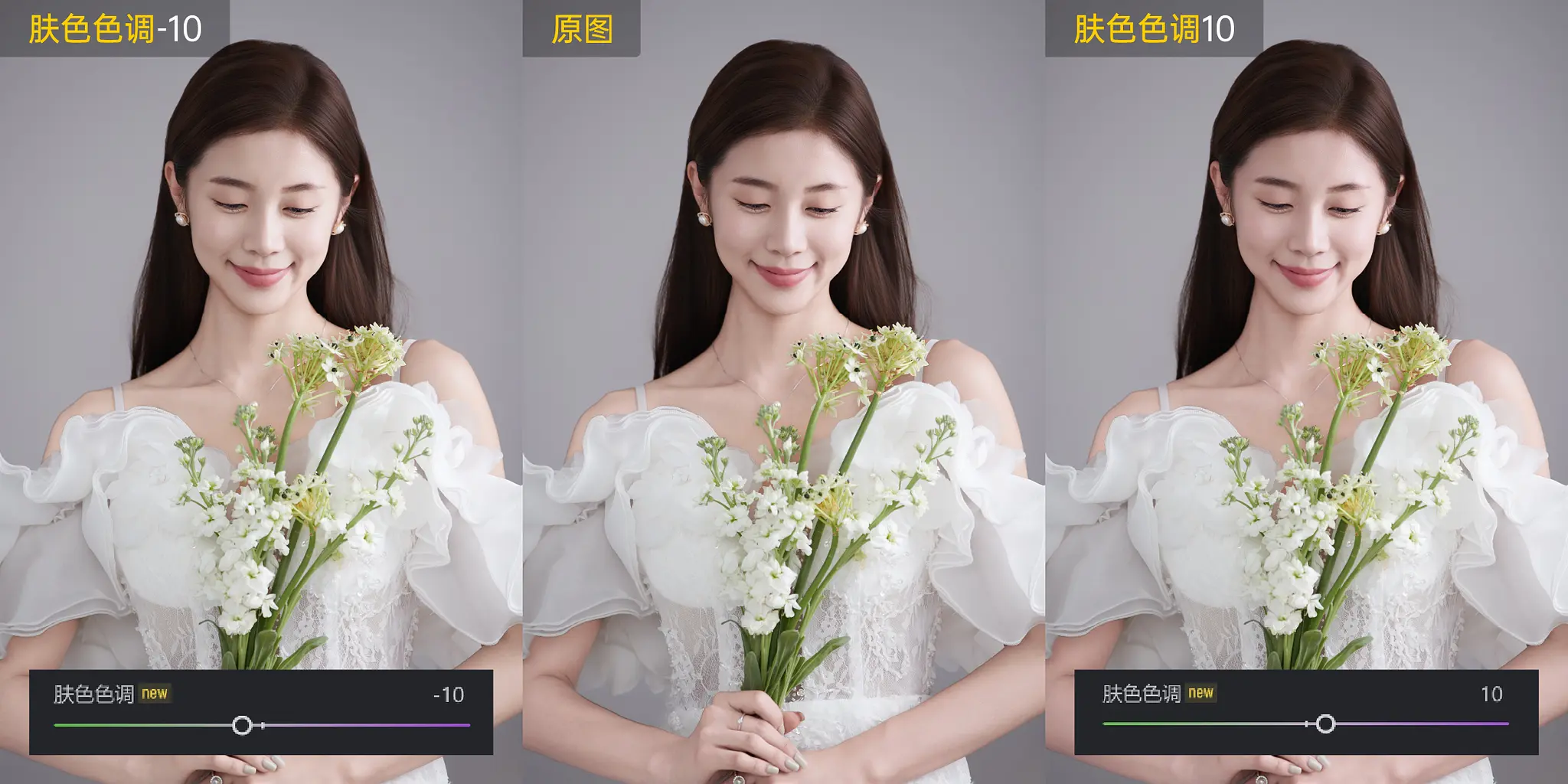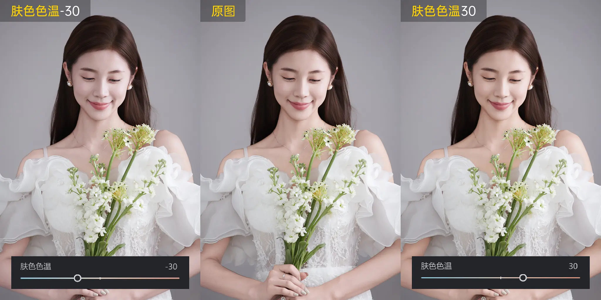 拉动滑杆精确控制肤色色温,滑杆向左可降低色温值,使肤色呈现冷色调;滑杆向右则提升色温值,使肤色呈现暖色调。