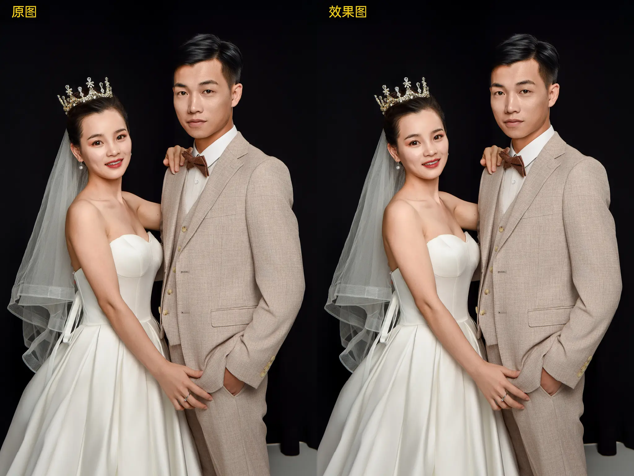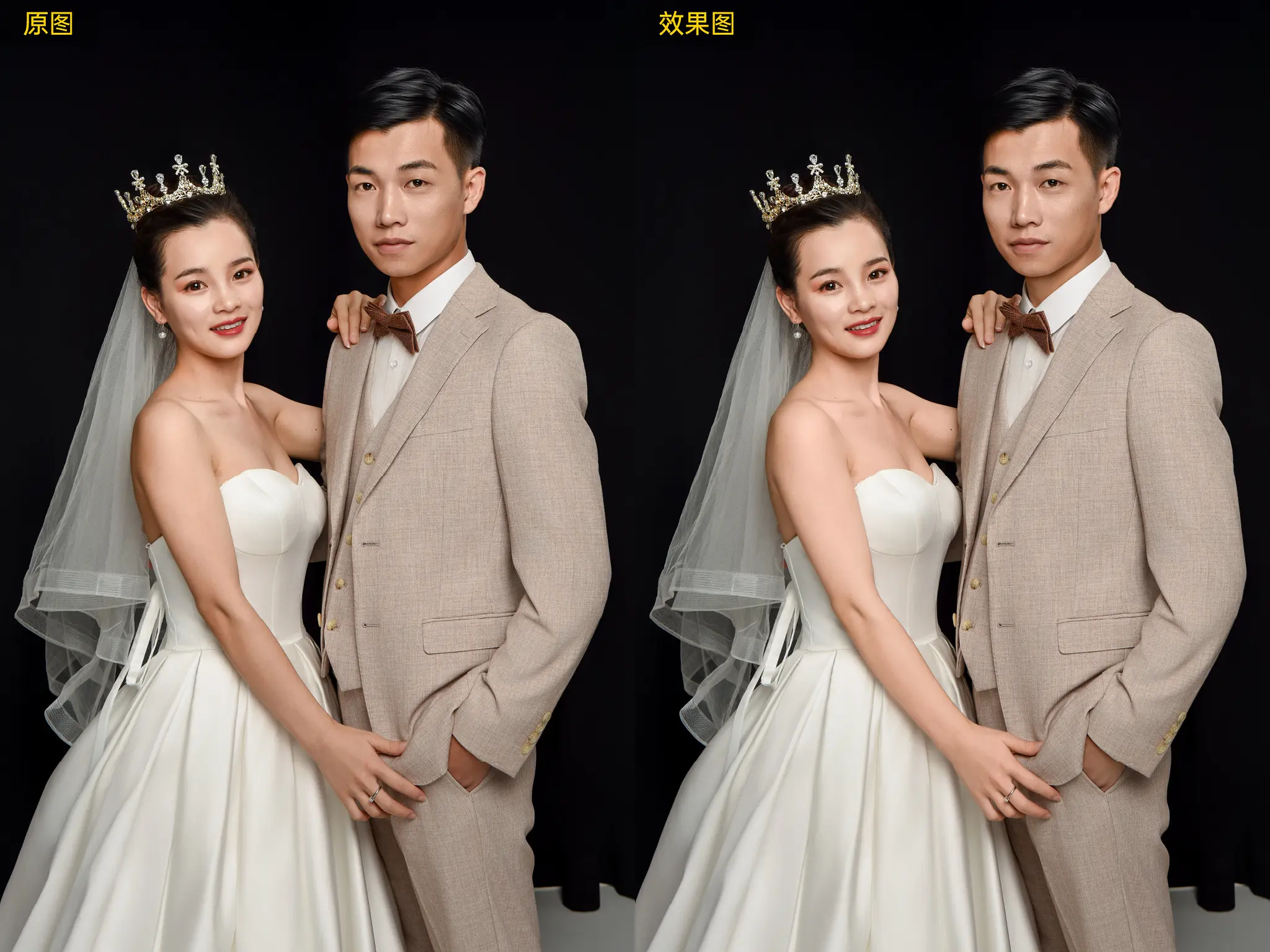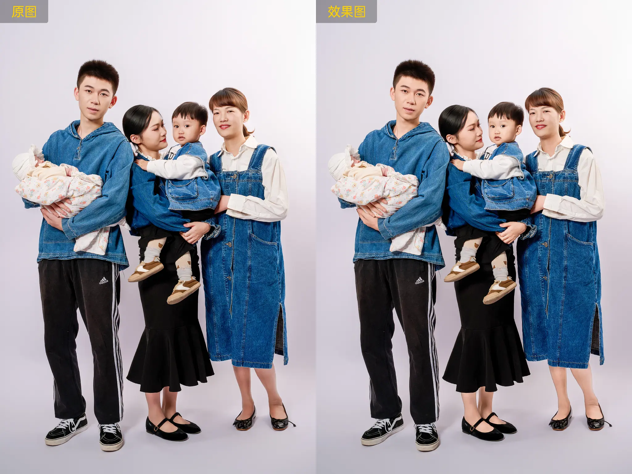 合照中以最亮的人脸为参考,自动调节其他人脸部和身体区域肤色(不包含最亮的人的脸部肤色)的色调与亮度,有效解决合照中多人肤色差异问题。使用该功能时推荐将人物属性切换至所有人。