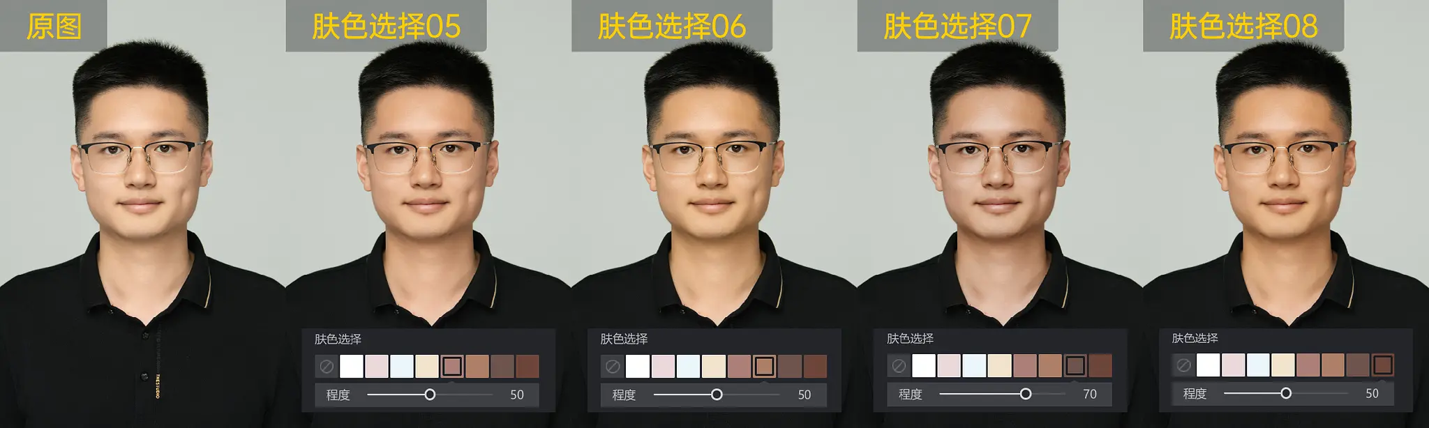 提供8种肤色可选,支持调整所选肤色程度。