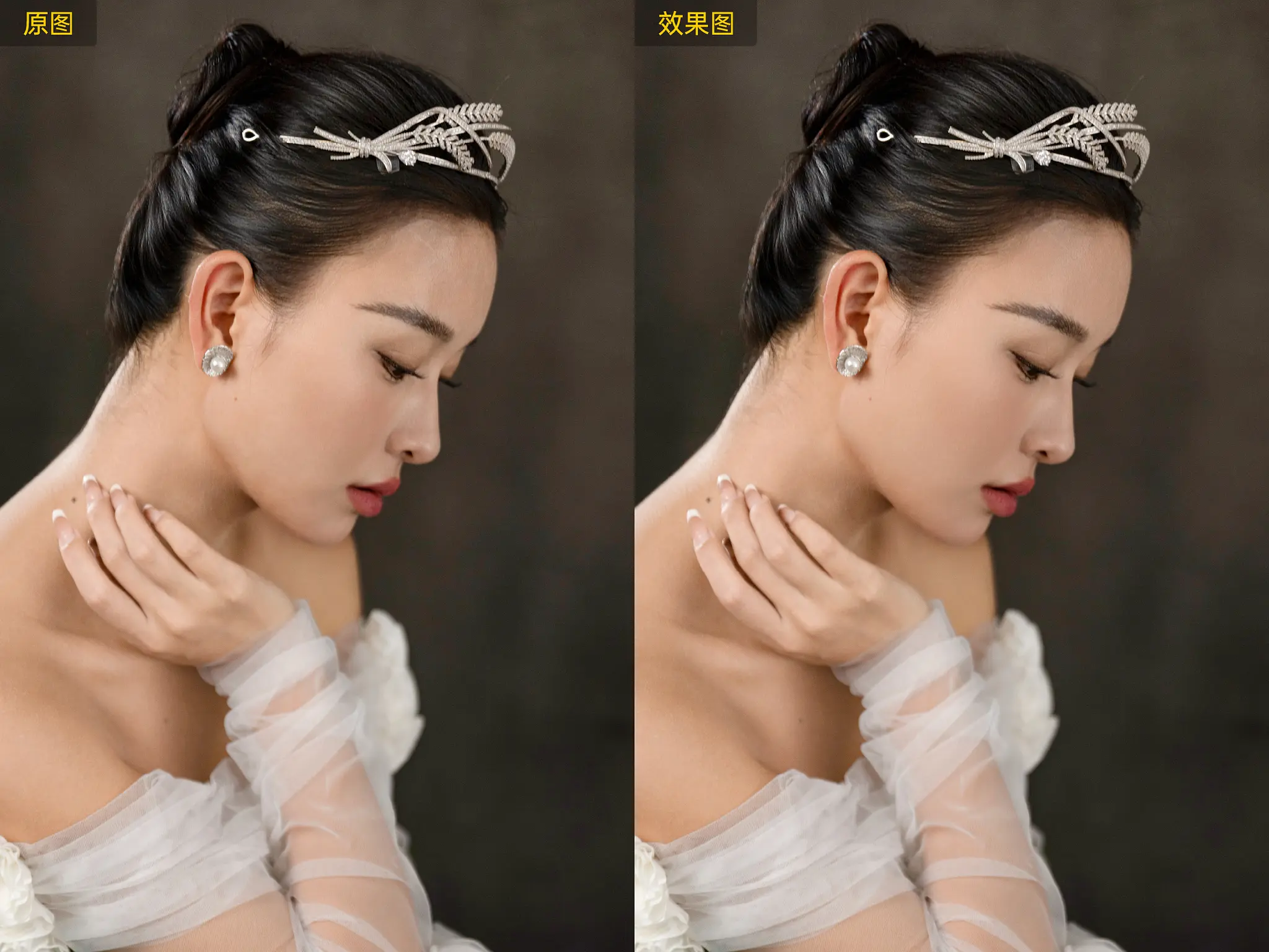 利用中性灰磨皮的修图手法,合理运用提亮和压暗对杂乱的光影进行平整,既让皮肤平整无暇,又最大程度的保留皮肤纹理细节,打造高保真磨皮效果。