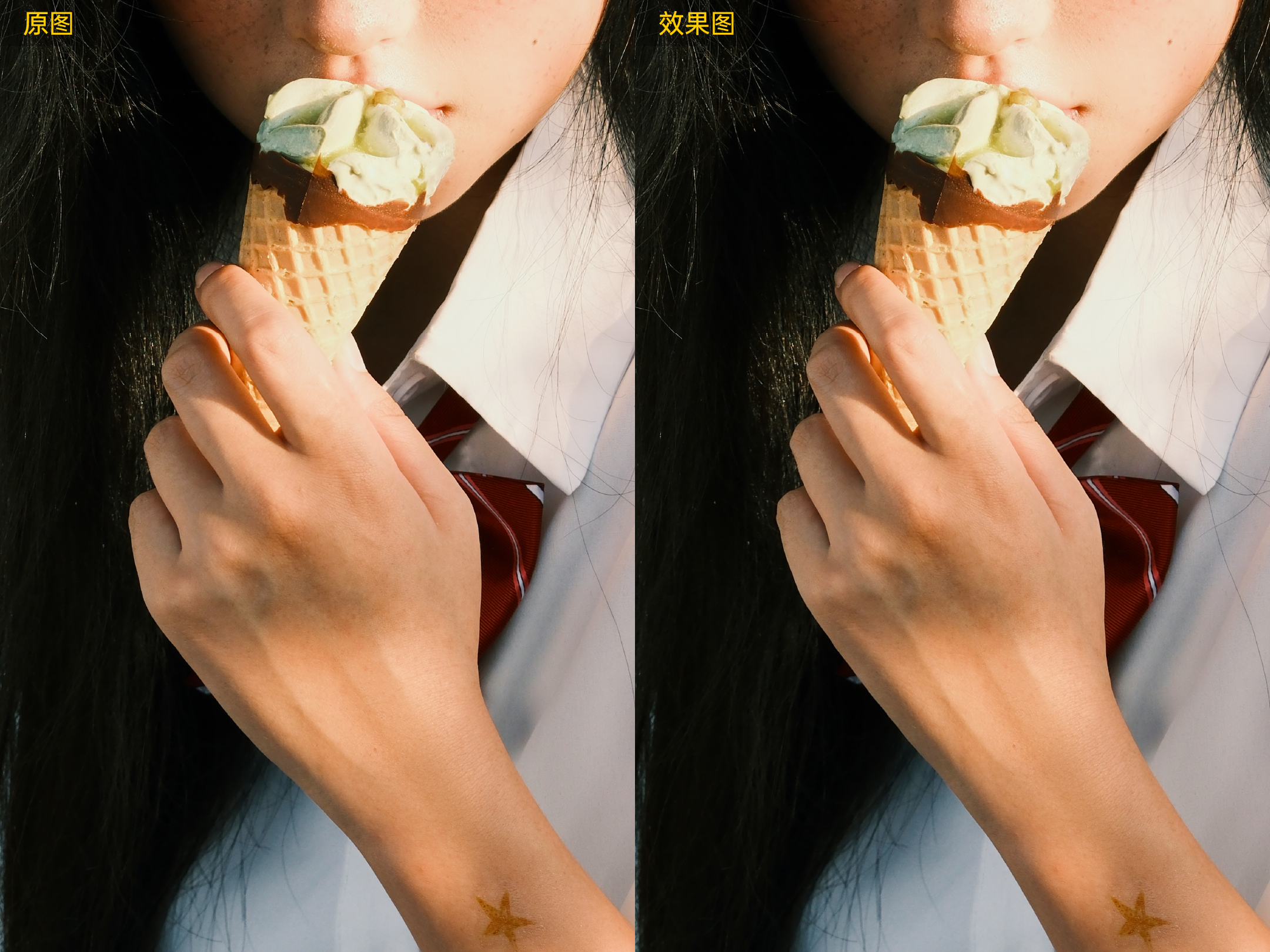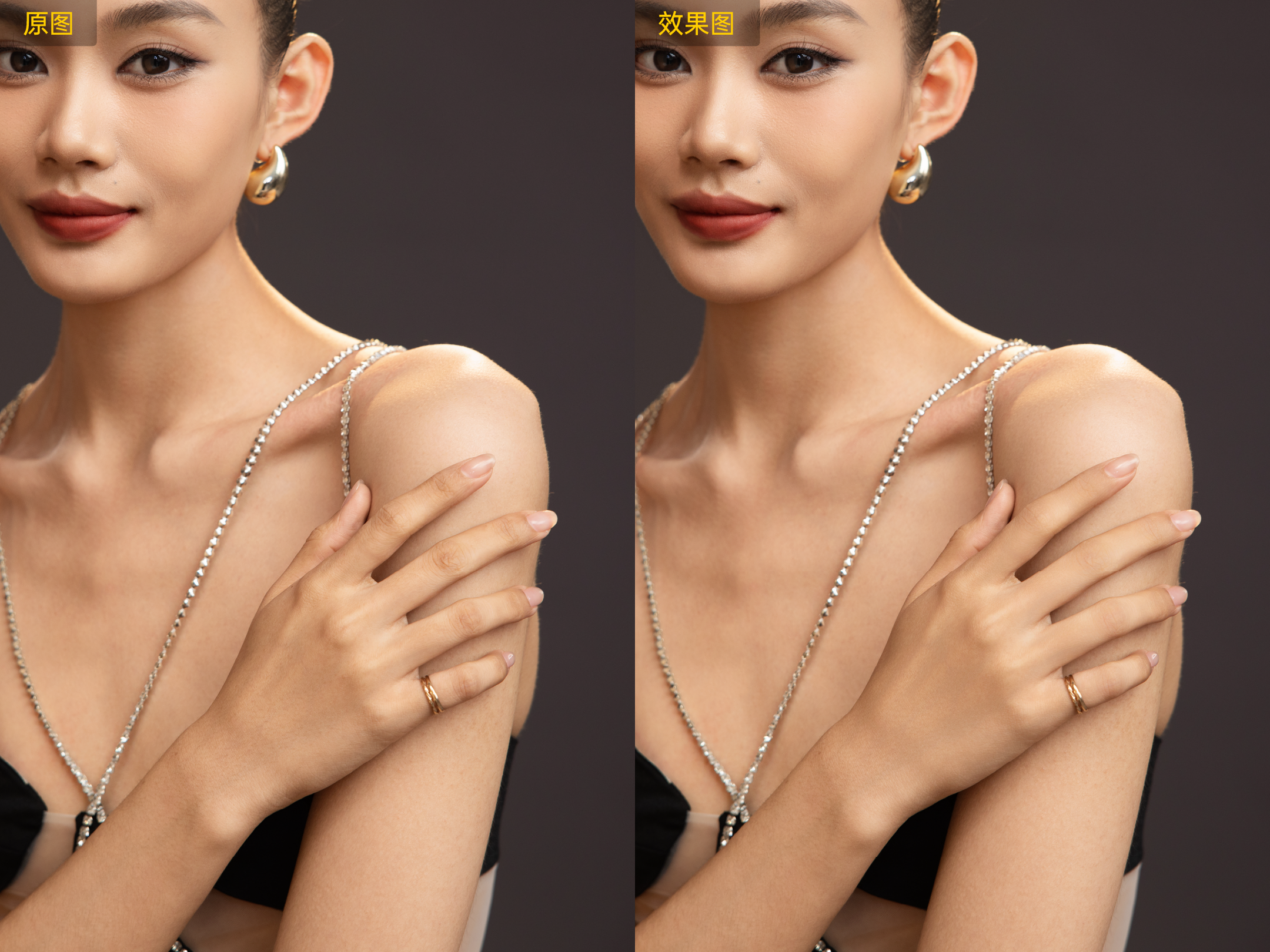 功能基于AI智能技术,精准检测手部骨骼结构与轮廓边界。可智能收窄手宽、纤细手指,优化指节,从而视觉上收窄手部轮廓,重塑纤巧修长的手部形态。