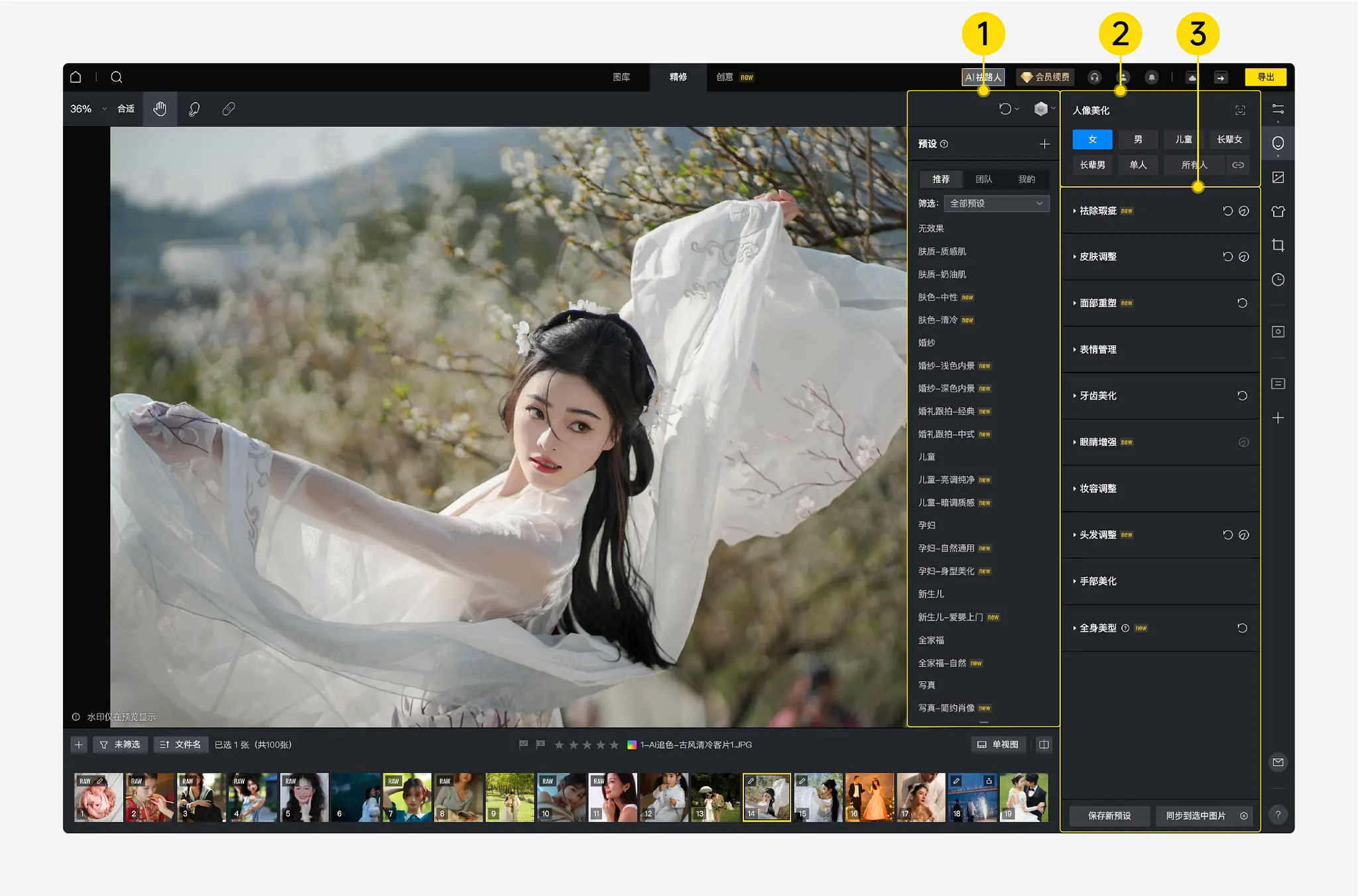 含祛除瑕疵、皮肤调整、面部重塑、表情管理、牙齿美化、眼睛增强、妆容调整、头发调整、手部美化和全身美型等10大功能。