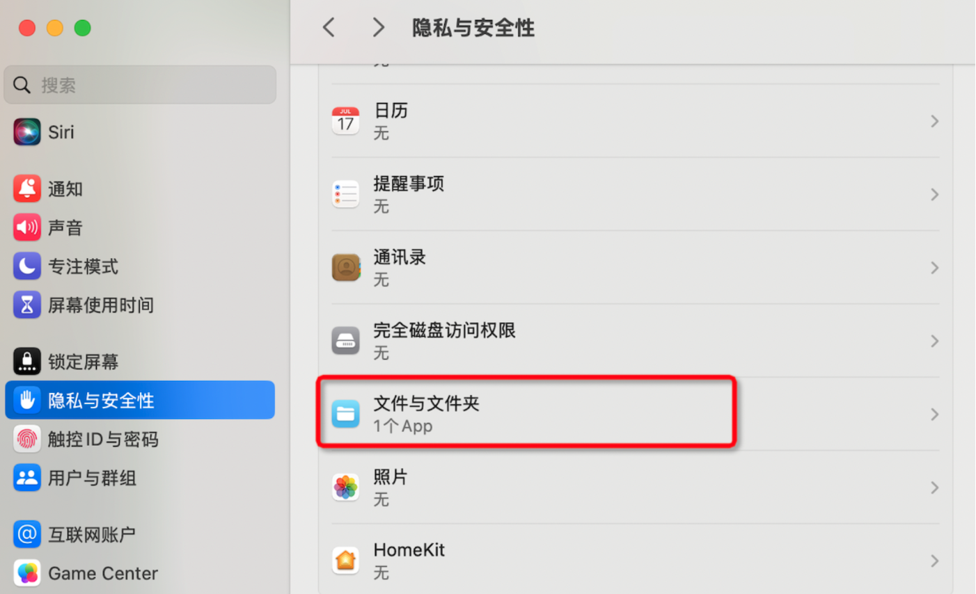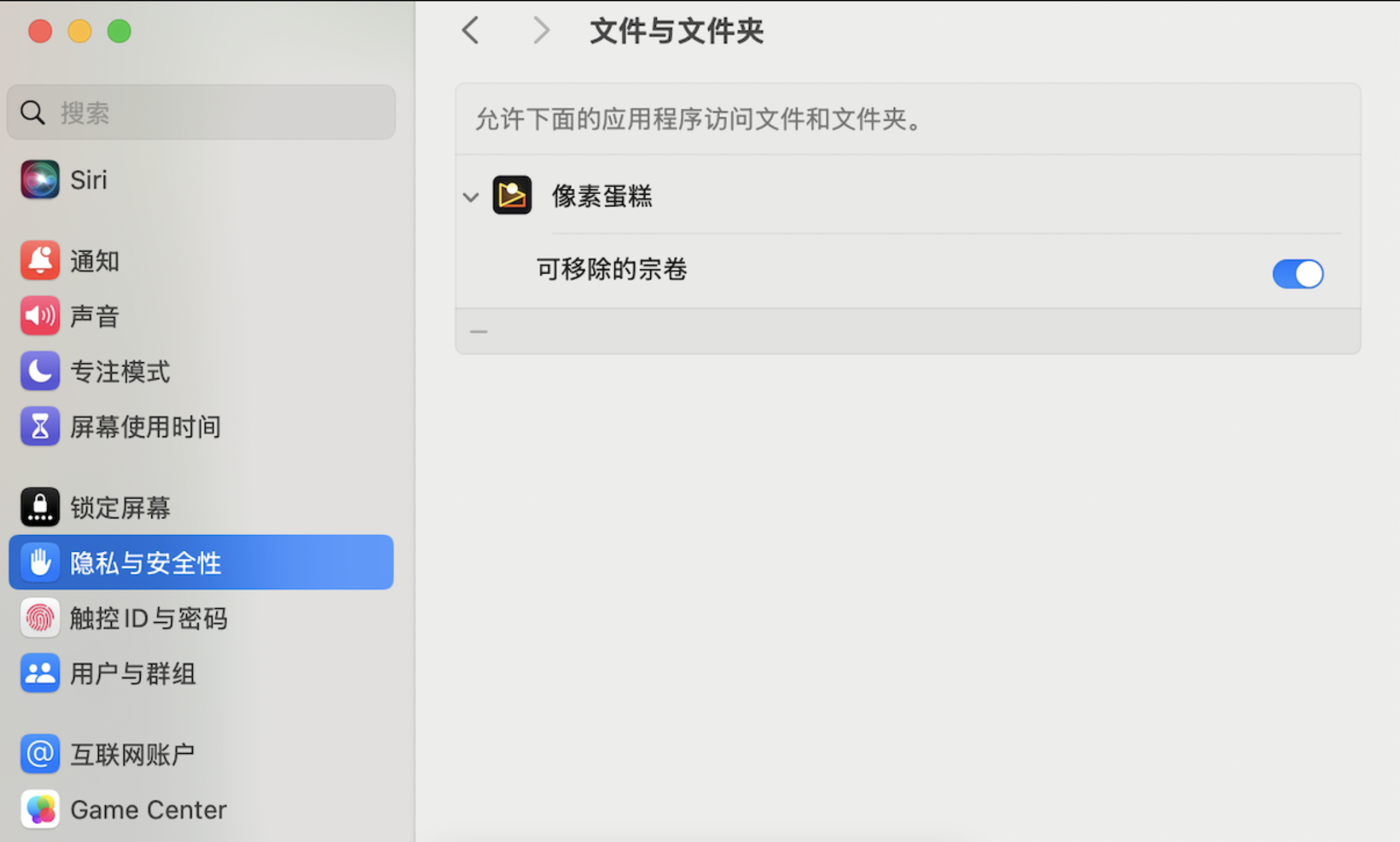 对于MacOS系统在15.0及以上的设备,还需在「隐私与安全性」→ 「文件与文件夹」,开启像素蛋糕的「可移除的宗卷」权限。