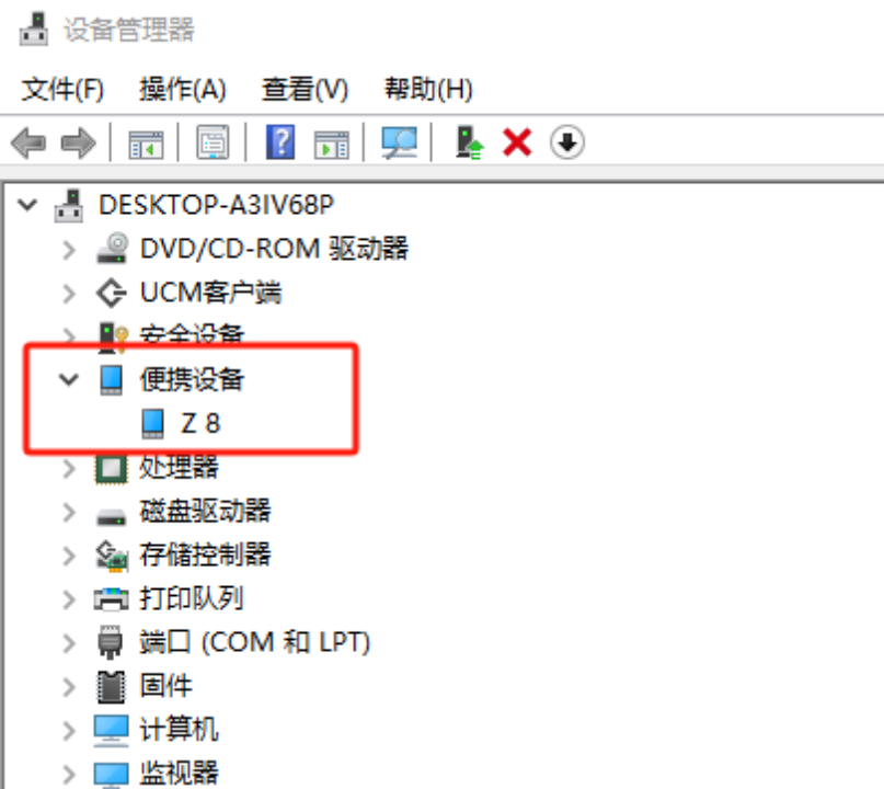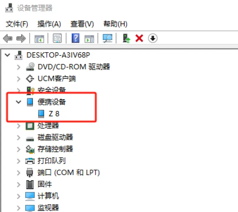 打开设备管理器,可查看到相机被检测为「便携设备」,如图所示。