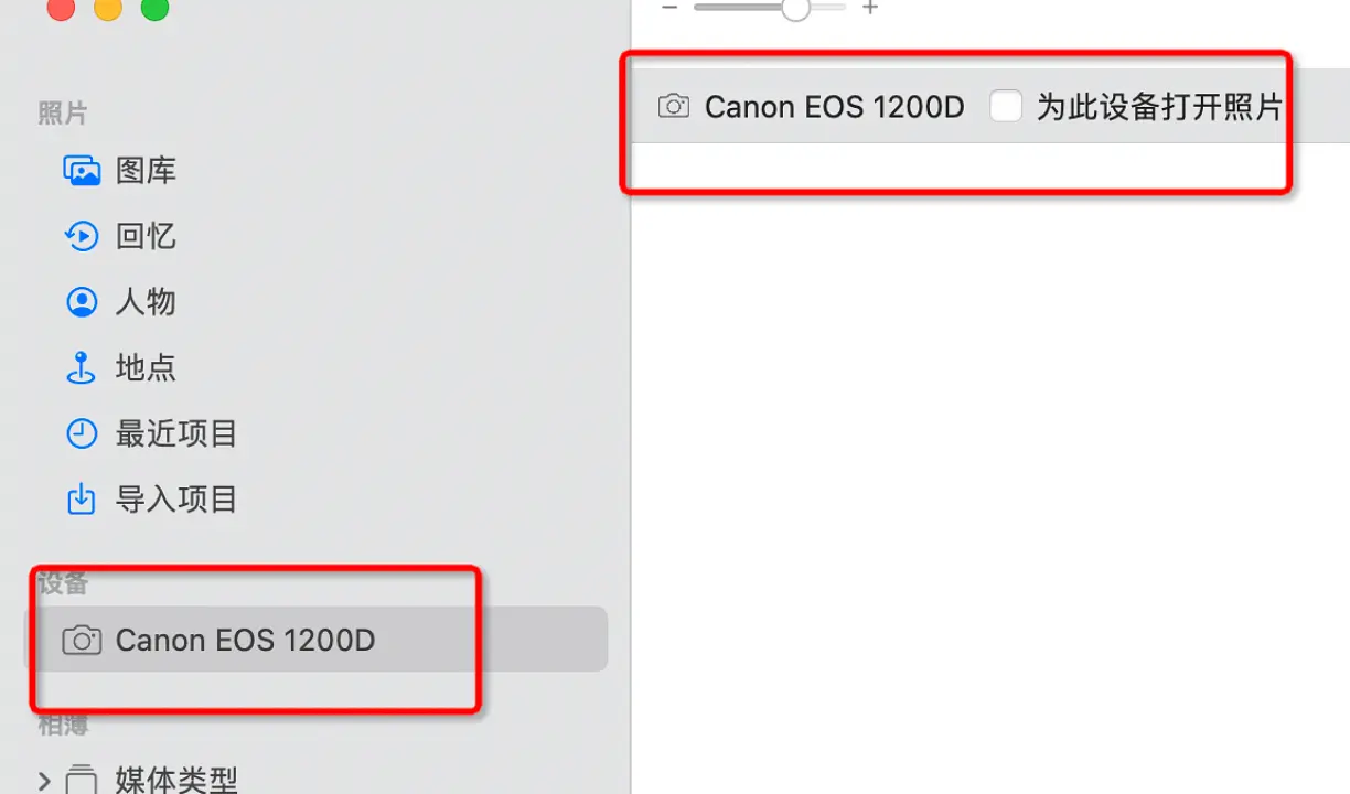 打开系统自带的照片软件,可以看到以相机型号为名的设备(注意:确认相机已经连接之后需要左上角退出照片软件,否则会因为设备被占用而导致联机失败)。