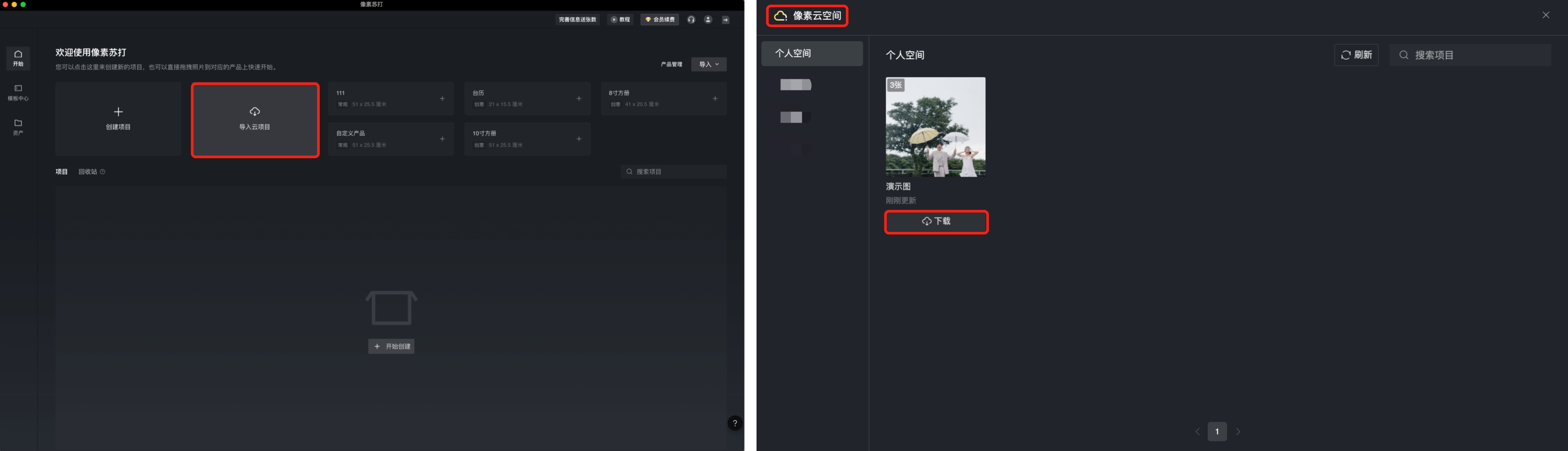 在像素苏打主页面,点击 「导入云项目」 按钮,进入像素云空间界面,选择需要排版的项目并「下载」。