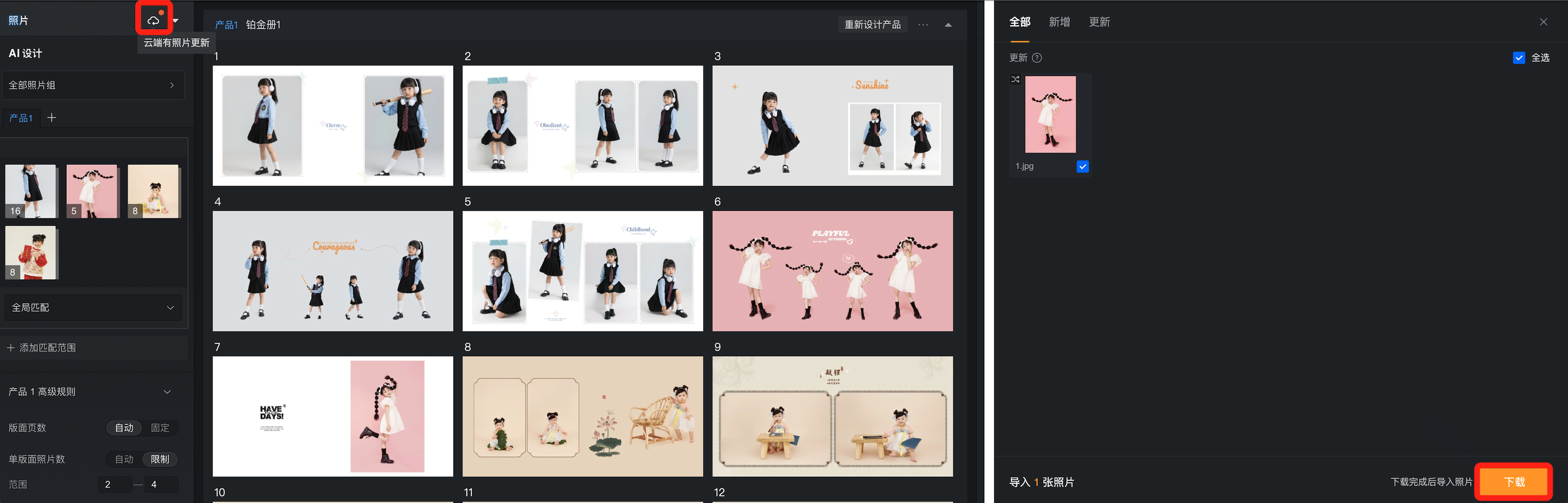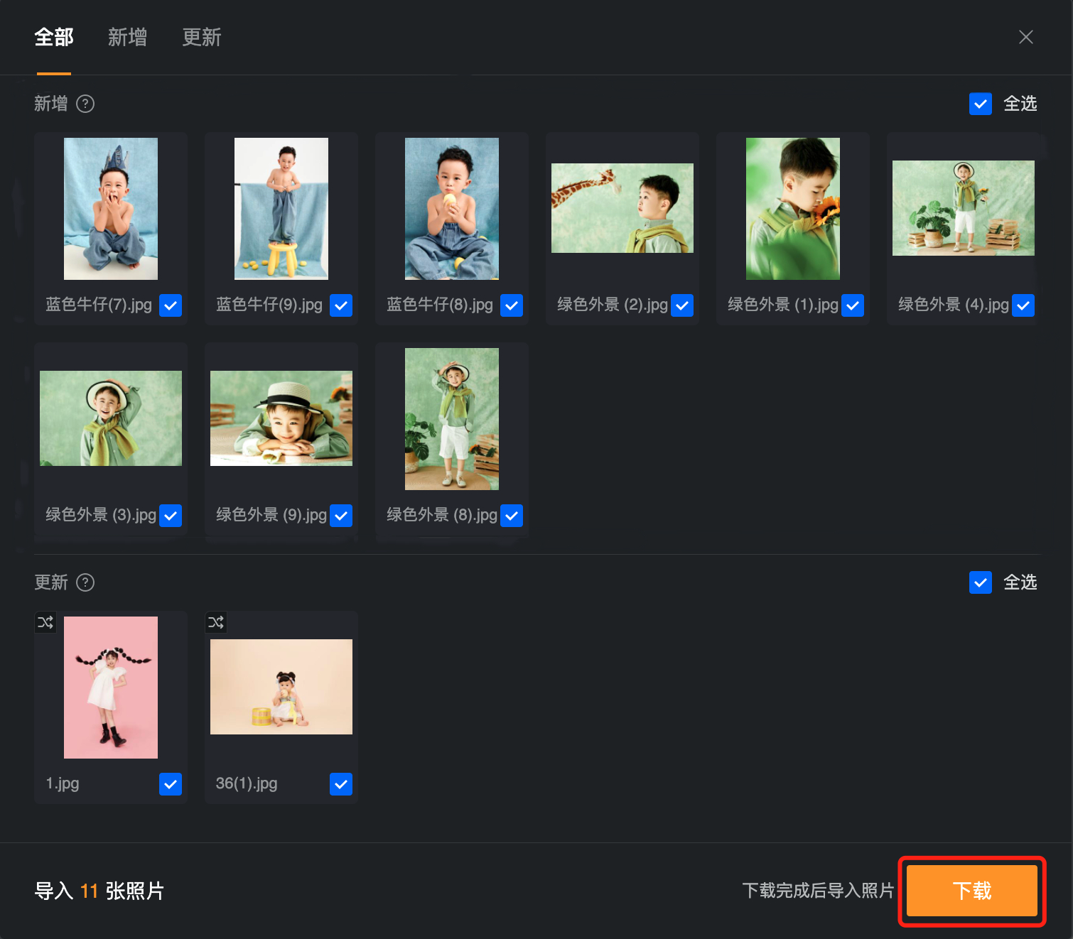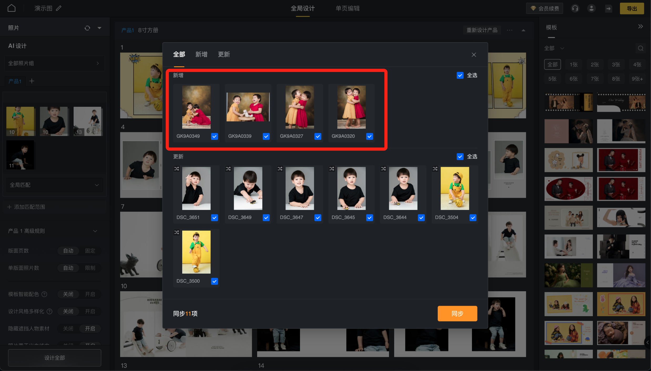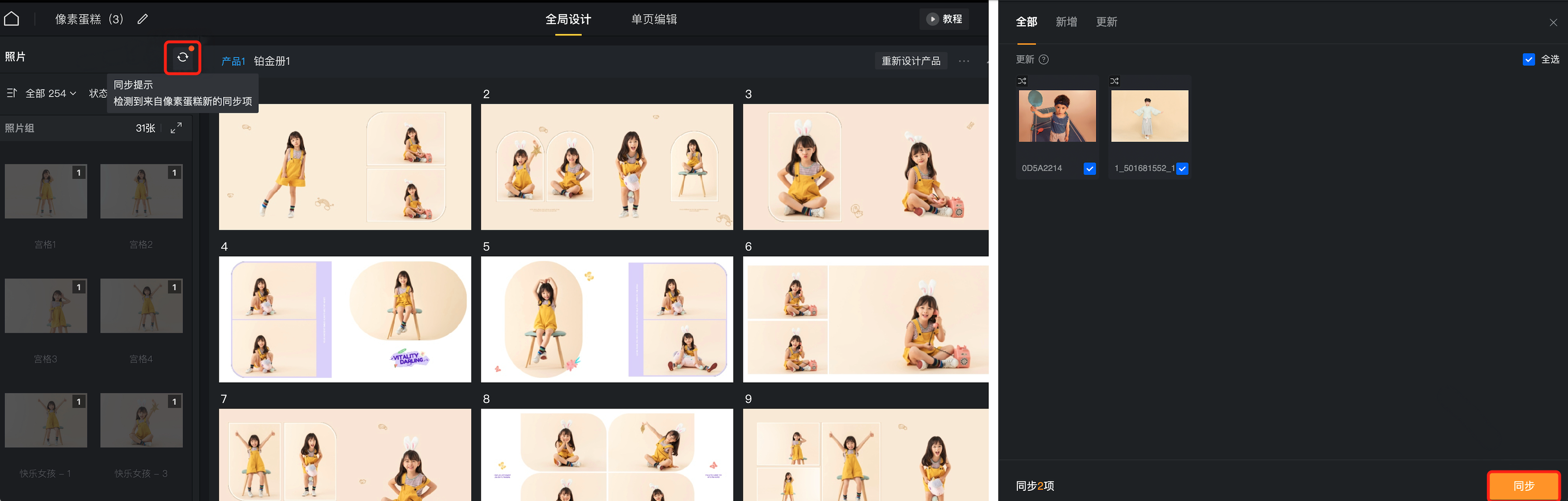 当蛋糕中某个项目添加了新图,只需在苏打中点击同步按钮,在弹窗中勾选「新增」分组下需要添加的图片并点击「同步」,即可批量添加这些图片,无需再手动操作导入。