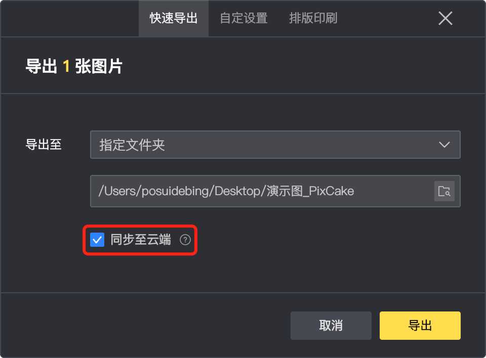 图片格式支持:无论是云项目还是本地项目,均支持同步 JPGPNG 格式的图片,暂不支持直接同步 RAW 格式图片,对于RAW 格式图片,需要先在像素蛋糕中导出为 JPG 格式,导出时需勾选「同步至云空间」(本地同步无需此勾选)。
