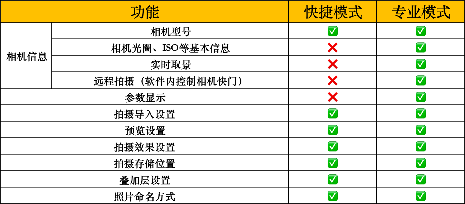 基于相机机型配置及电脑设备不同,桌面版有线联机时将区分专业模式与快捷模式,依据相机的兼容性,系统将自动选择稳定性最佳的模式进行相机联机。